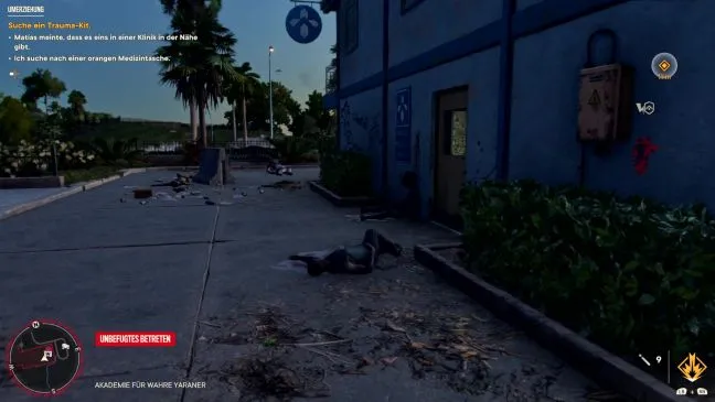 Матиас лечит пациента, и ему нужен травматический набор, который Вы должны получить в ближайшей клинике. Для этого идите к новому маркеру на востоке, который приведет вас к небольшому белому зданию клиники.