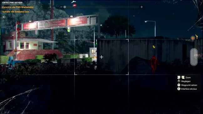 В этом случае сначала расстреляйте стрелка с крыши, а затем расправьтесь с оставшимися врагами по своему усмотрению. Если вы хотите взять контрольную точку, не забудьте уничтожить темно-красный рекламный щит FND в юго-восточном углу.