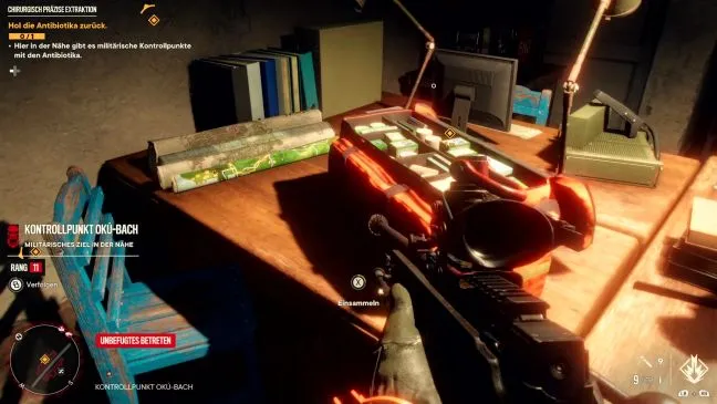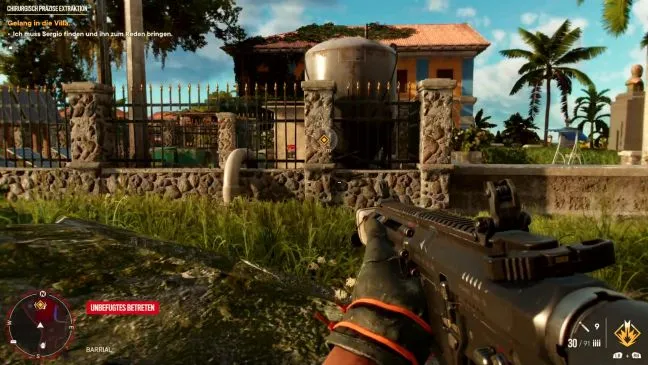 Строго говоря, вы направляетесь к контрольной точке Оку-Бах, которую можно захватить при удобном случае. Для этого лучше всего подойти с запада по дороге и обнаружить на внешней стене левого здания сигнальную будку, которую расстрелять с расстояния. Спрячьтесь в клумбе справа и найдите двух охранников, которые, к счастью, находятся достаточно далеко друг от друга.