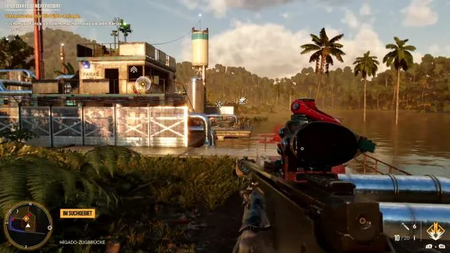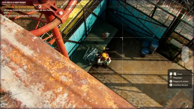 И наконец, вернитесь к широкому главному входу с восточной стороны, через который ведет пешеходный мост и который снова обозначен широкой вывеской БиоВида. Сразу за ним вы увидите одинокого охранника, которого вы сначала устраните. Затем войдите в подъезд и пройдите прямо по широкому переходу. За ним справа вы увидите строительные леса и лестницу, прислоненную к деревянной свае. Поднимитесь по ней и перебегите по трубам направо, чтобы незаметно добраться до широкого здания в центре комплекса.