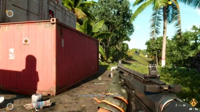 Теперь о цели: необходимо забраться на контейнер, подняться по лестнице и открыть оранжевый ящик с электричеством, чтобы уничтожить его. Забраться на контейнер можно благодаря ящикам с западной стороны.