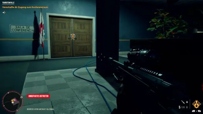 Издалека Вы наверняка увидите нескольких охранников, которые слоняются перед входом в здание. Несмотря на соблазн убить их из снайперской винтовки, лучше воздержаться от этого: Иначе слишком велика опасность, что трупы будут обнаружены и создадут проблемы.