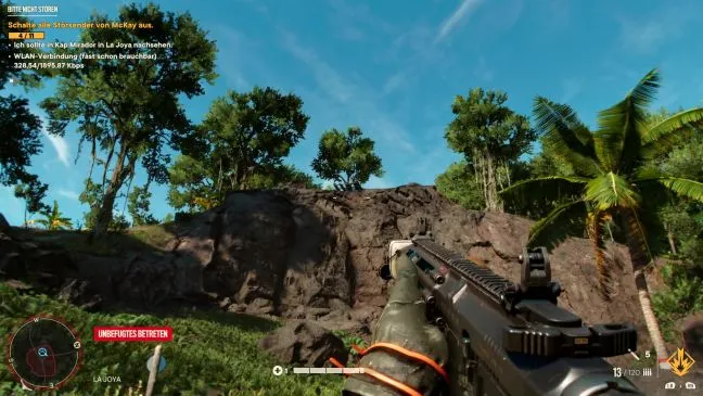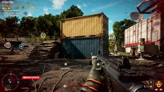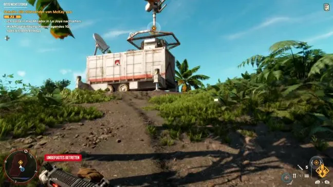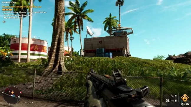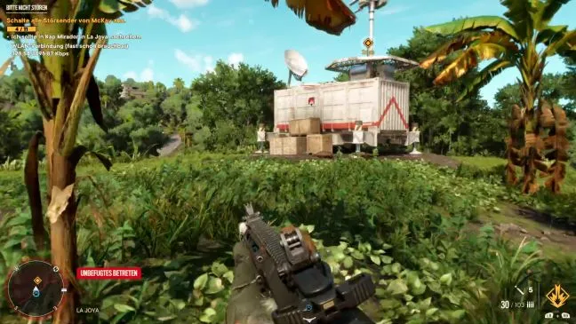 Если подойти к объекту с севера, то непосредственно перед ним можно забраться в воду и по лестнице попасть в запретную зону. Вы сразу же увидите глушилку слева от себя и сначала должны забраться на белый контейнер перед ней. Затем можно забраться на небольшой деревянный поддон по диагонали слева и оттуда подняться прямо на решетчатую платформу с электрощитком.