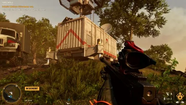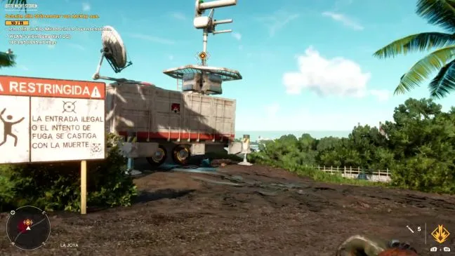 Второй глушитель: Найдите небольшую поляну рядом с первым глушителем и к юго-западу от него, где стоит еще один контейнер со спутниковой антенной. Будьте осторожны, если вы идете туда по прямой: Вы наткнетесь на небольшой знак "Стоп" с надписью No Pase, рядом с которым в траве натянут провод. Чтобы подстраховаться, отключите его, прежде чем идти к контейнеру.
