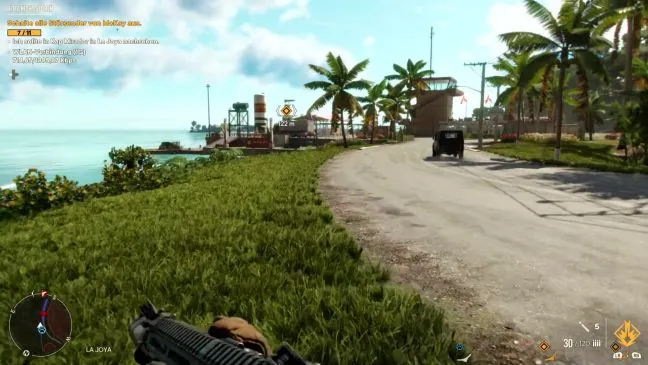 Следующую лучшую линию вы обнаружите дальше на юго-востоке и укажете на третий глушитель, который охраняют несколько солдат. Как только они будут убиты, направляйтесь к зданию офиса НДП Ла-Хойя, расположенному к юго-западу от передатчика, и обойдите его с западной стороны. Там вы увидите лестницу и лестницу на дальнем правом краю. Последняя приведет вас на крышу и к веревочному спуску, по которому вы сможете добраться до электрощитка передатчика.