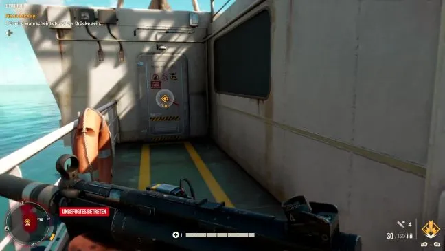В другом конце коридора несколько лестниц ведут на палубу, где маркер назначения указывает на рулевую рубку. Поскольку вы уже осматривали тот или иной корабль по ходу игры, то, скорее всего, догадаетесь о следующем маршруте: Нужно броситься налево или направо возле перил в направлении носа корабля, подняться по первой лестнице, когда доберетесь до места назначения, а затем пробежать по узкому коридору слева. Там Вы наткнетесь на белую дверь с оранжевой ручкой, которую нужно нажать, чтобы попасть к МакКею.