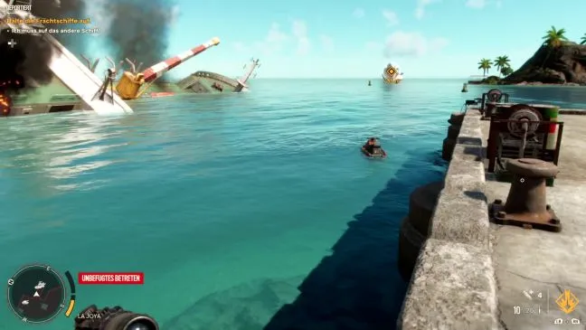 Тем временем Маккей со вторым грузовым судном уже отплыл на значительное расстояние к востоку, поэтому Вам необходимо моторное плавсредство. К счастью, рядом с пристанью в северо-восточном углу действительно есть подходящая моторная лодка, так что вам остается только забраться на нее и прицелиться в корабль.