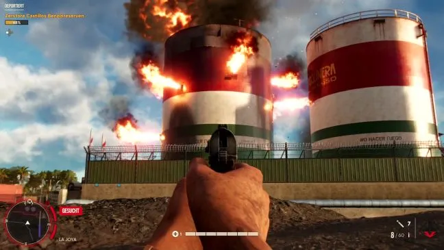 - В Пуэрто-Де-Ла-Хойя Вы обнаружите наибольшее количество силосных ям: Вам предстоит уничтожить две широкие силосные ямы, одну узкую, две широкие и еще одну узкую силосную ямы на южной стороне с запада на восток. Для этого даже не нужно входить в зону, можно целиться во все силосные башни снаружи, поскольку они возвышаются над ограждением. В северо-западном углу есть еще одна узкая силосная башня, но для успешного выполнения задания не обязательно ее разрушать.