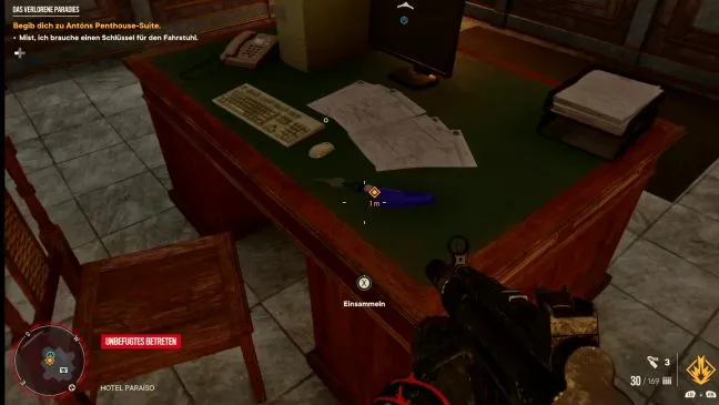 После того, как отель будет охраняться, необходимо попасть в пентхаус Антона. Для этого, однако, необходим ключ, за которым Вы возвращаетесь в зону входа и смотрите на стойку с восточной стороны. Между ними находится небольшой коричневый стол с искомым ключом.