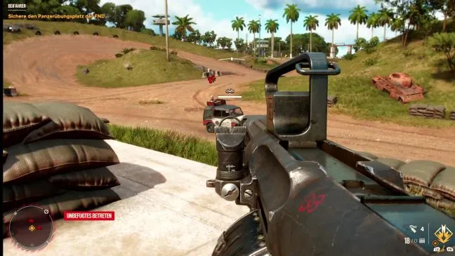 Площадь, конечно же, кишит солдатами, большинство из которых разъезжают кругами на своих машинах. Если внимательно осмотреть периметр со стороны, то в центре плоского вытянутого холма можно увидеть пушку. Найдите его и используйте многочисленные мешки с песком в качестве укрытия на своем пути.