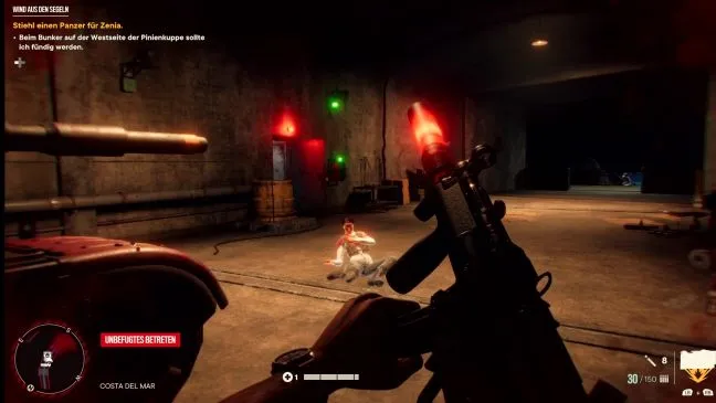 К западу от Лозании, или в нескольких сотнях метров к северо-востоку от убежища Трова, находится Мураль Де Ла Триада. Там остановился Зения Зайас, которому нужен военный танк. Затем на северо-западе Коста-Дель-Мара появится новый маркер цели, который приведет вас к бункеру на западном склоне соснового холма.