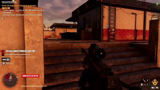 Фактический пункт назначения, где находится майка, находится недалеко от вас. Однако, если вы пойдете туда опрометчиво и напрямую, то привлечете внимание половины базы. Лучше добегите до юго-восточного угла, перелезьте через парапет с восточной стороны и сразу же снова поднимитесь по крюку слева на каменную дорожку. Теперь направляйтесь к указателю цели и поднимайтесь по лестнице, ведущей к зданию. Держитесь левее, пока не увидите еще одно здание с лестницей по диагонали справа. Вы можете проигнорировать ее, пока будете обходить здание справа.