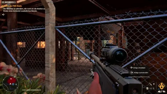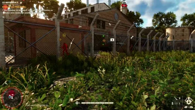 Лучший шанс, который у Вас есть: пересеките пропасть, заберитесь на крышу домика охраны перед Вами и выстрелите в будку. После этого бегите прямо назад и обегите весь район, пока враги ищут Вас. Теперь вы можете застать врасплох солдат, расположившихся сзади, или отправиться в юго-западный угол района, где вас ждет еще одна дыра в заборе. За ней находится большая белая силосная башня, на которую можно забраться по лестнице и выцеливать врагов сверху. Если у вас недостаточно места, чтобы переместиться туда, воспользуйтесь веревочным спуском и расположитесь на крыше большого здания.