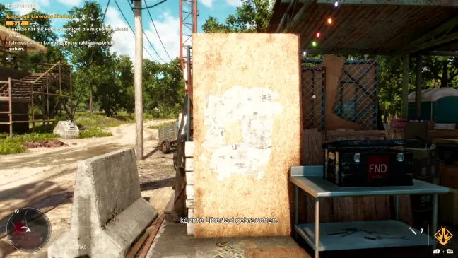 Рядом находится отель Villa Judía, наполовину утопающий в болоте. К северо-востоку от нее находятся еще несколько домов и большая крытая площадка. Ее можно узнать по множеству ящиков и цветным лампочкам, свисающим с края крыши. В северо-западном углу платформы найдите светло-голубой стол, на котором стоит ящик FND. Непосредственно рядом с ним к забору прислонена большая деревянная доска, на которой висит вышеупомянутая записка: Доставка из Монтаны.