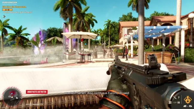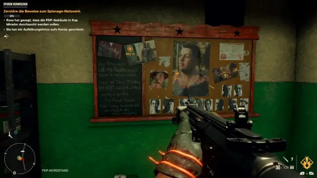 - Второй маркер приведет вас в офис НДП в Ла-Хойе. Попав туда, сначала уничтожьте охранника с северной стороны, который сидит на узкой платформе над входом. Также следует следить за центральным зданием и застрелить первого вышедшего солдата. Затем можно проникнуть в здание и сразиться с оставшимися внутри врагами. В самое позднее время на радаре должны появиться не один, а три маркера. Все они ведут к дальнейшим штыревым доскам, любые две из которых необходимо уничтожить.