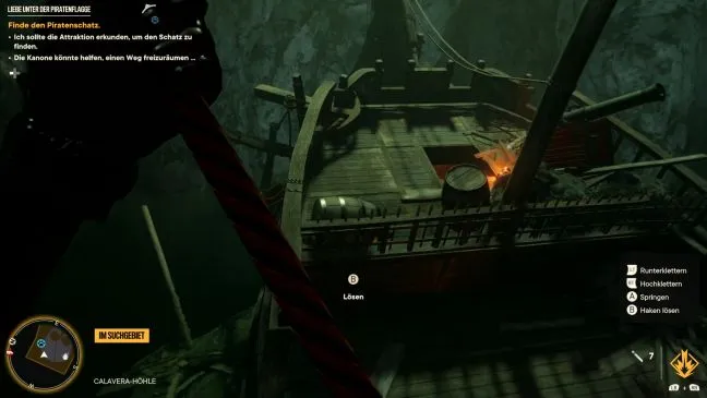 На самом деле ответ довольно прост: пушка находится на палубе корабля. Однако добраться до нее снизу невозможно, так как путь преграждает парапет. Однако в вашем распоряжении остается альпинистский крюк, за который вы снова цепляетесь и теперь смотрите вниз, на корабль. На востоке вы увидите пушку, а рядом с ней - открытый люк. Приземлитесь прямо рядом с ним и используйте пушку, чтобы взорвать груду обломков. Через люк вы попадете внутрь корабля и сможете проплыть по воде обратно к альпинистскому крюку.
