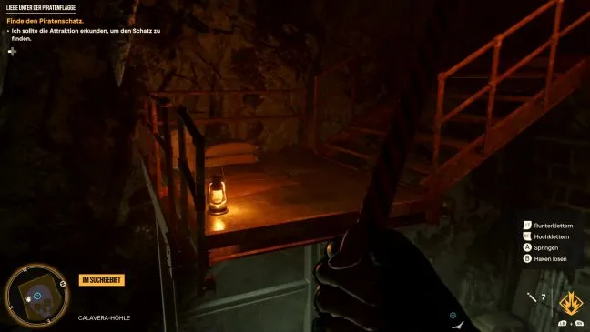 Этот поиск сокровищ приведет вас на восточное побережье острова, практически в самый центр Барриала. Узнать нужное место можно по большому черепу на радаре. Если пройти еще несколько метров на север по холму в сторону побережья, то справа вы придете ко входу в пещеру Калавера. На краю стоит штурвал, с которого свисает ящик, и начинается ваш поиск сокровищ.