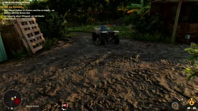 Данило также приземлится и устроится поудобнее перед зданием. Также найдите квадроцикл в центре грязной дорожки. Вы должны сесть на него сразу после очередного кормления, чтобы продолжить следовать за Данило.