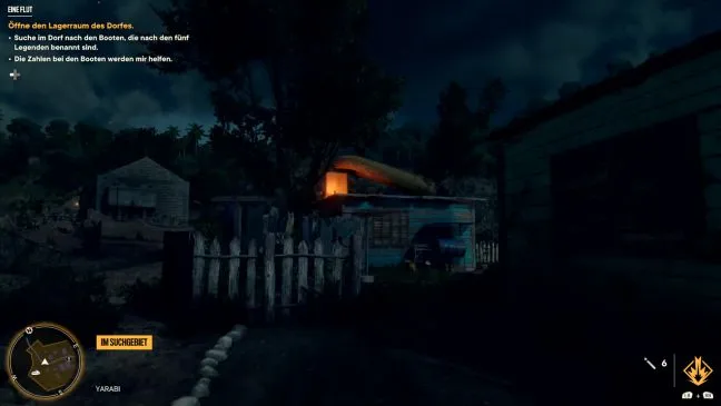 - Осмотрите дома на северной стороне главной дороги, поднимитесь к Г-образному дому на крайнем северо-востоке и посмотрите на перевернутую синюю лодку с надписью El Lucky. Перед ней лежит лист бумаги с цифрой 3.