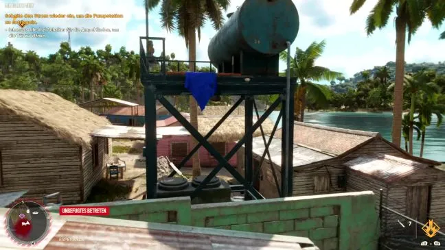 Электрический кабель на востоке приведет Вас к большим строительным лесам, на которых стоит бирюзовая цистерна. На нее нужно забраться, перебравшись сначала через зеленую стену с северной стороны, а затем на крышу большого белого сарая. Сразу же развернитесь и с разбегу прыгните на платформу рядом с танком. Там уже можно нажать на третий выключатель слева.