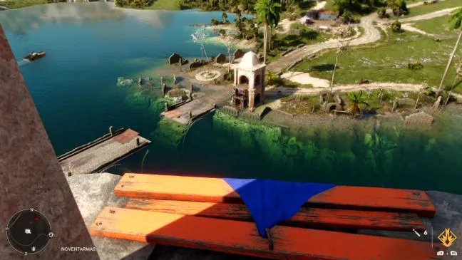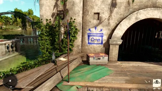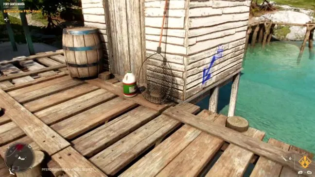 Там Вы заметите небольшой белый домик, который следует осмотреть со всех сторон. Таким образом, Вы наткнетесь на следующую стрелку, указывающую вниз и привлекающую Ваше внимание к пустоте под причалом. Прыгните в воду и возьмите криптограмму, которая прикреплена к опорной балке причала.