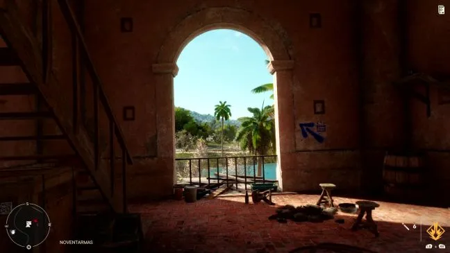 Затем Вы приземлитесь у символа глаза и еще одной стрелки, указывающей прямо вверх. Посмотрите вверх на потолок и повисните на следующем попавшемся крюке. Достигнув вершины, спрыгните на землю и возьмите криптограмму на юго-западной колонне.