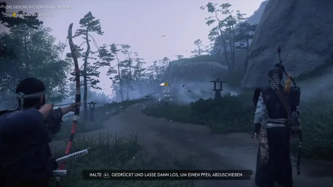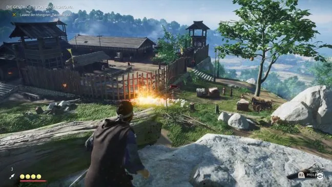 Вы должны прицелиться из своего лука прямо во всех остальных монголов и выстрелить в них. Поскольку на них не очень хорошая броня и особенно нет шлема, целиться нужно прямо в голову и таким образом наносить одно смертельное попадание за другим. С другой стороны, не будьте слишком нетерпеливы и пригнитесь к лежащему поперек стволу дерева, чтобы избежать попадания.