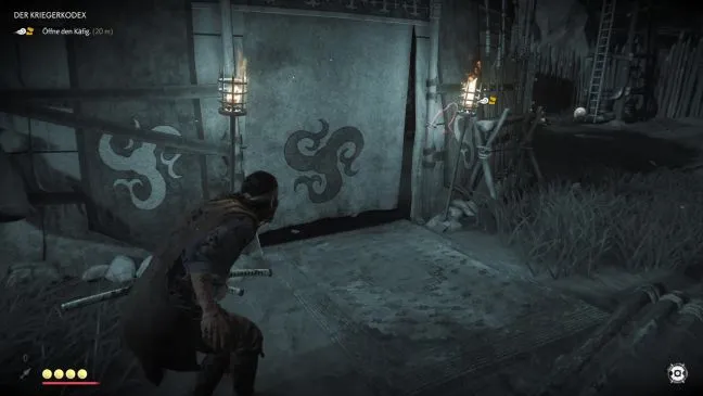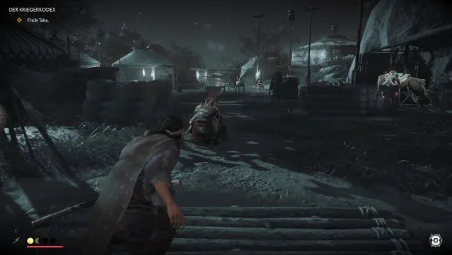 Вернитесь к костру и прицельтесь в склон с деревянными ступеньками. Он приведет вас к другой палатке, где вы сможете обнаружить врага благодаря сфокусированному слуху. Теперь встаньте перед входом и наблюдайте за противником, не заходя в палатку. Монгол марширует через равные промежутки времени и пригибается перед полкой. Поскольку в это время он поворачивается к Вам спиной, Вы можете в этот момент войти в палатку и нанести удар.