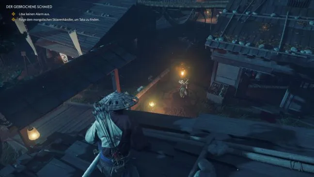 Поэтому дождитесь, пока Кенджин загрузит свою тележку, и следуйте за ним и Юной. Как только вас об этом попросят, спрячьтесь в телеге и продолжайте ждать, пока не окажетесь в большом форте Азамо Бэй. Внутри проберитесь вслед за Юной и вместе с ней заберитесь на небольшую крышу, чтобы понаблюдать за работорговцем. Вы узнаете его по горящему факелу, который он несет.