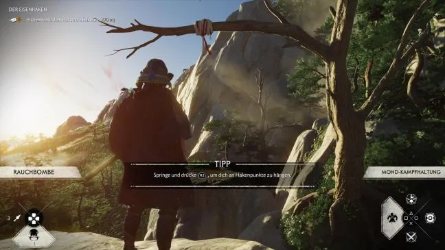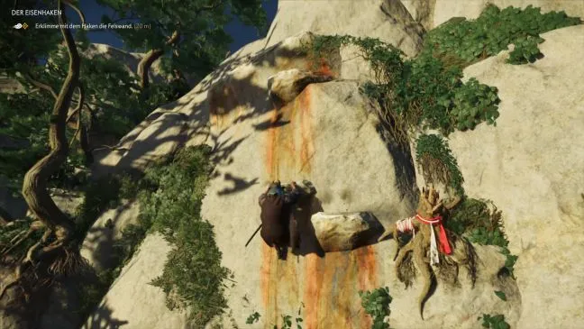 На месте изолируйтесь от своих союзников: Пока они едут прямо вверх по склону, идите по узкой тропинке слева от них. Она приведет вас к обрыву, где вам придется сойти с лошади. Теперь обратите внимание на ветку, торчащую из скалы перед вами: в середине к ней прикреплено что-то вроде красно-белой ткани. Теперь Вы сможете использовать эти точки зацепа благодаря железному крюку и перемахнуть на другую сторону обрыва.