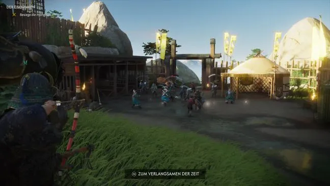 Наконец, должен остаться лучник, который будет стрелять по Вам сверху и которого Вы сможете достать благодаря обрывистому скальному склону. Таким образом, вы уничтожили всех монголов на месте и теперь можете дать Рюдзо сигнал к атаке на новый целевой ориентир. Сразу же откройте ворота рядом с ней и помогите своему союзнику с помощью лука, прежде чем вступить в бой с мечом. Если один из соломенных шляп упадет, вы можете оживить его, но это не обязательно. Вы все равно выиграете миссию, если выживете вы и Рюдзо.