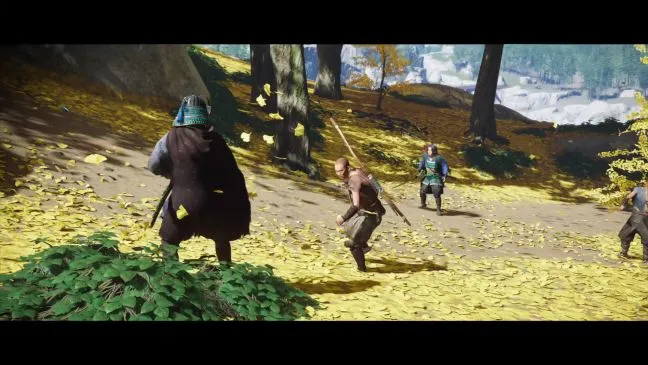 Лучше всего забраться на скалу рядом с местом боя и подманить к себе нескольких бандитов. Как только их станет слишком много, спрыгивайте вниз и бейте врагов Масако в спину. В остальном вам следует в основном позаботиться о щитоносцах, которых больше, с помощью водной боевой стойки. На крыше здания также находится лучник: вы можете либо выстрелить в него из лука, либо забраться к нему на тележке.