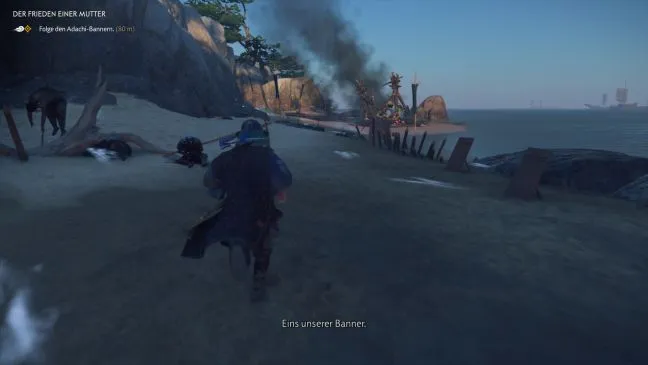 Масако ищет своих погибших сыновей. Следуйте за ней на пляж, где осмотрите павшего солдата. Затем найдите еще одно синее знамя Адачи. Вы найдете их у трупов лошадей на юге.