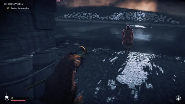 Сначала посмотрите в сторону реки и ударьте первого злодея, который стоит на коленях перед водой. Теперь быстро (!) развернитесь и найдите слева от бочек еще одного врага, который повернулся к Вам спиной. Если он тоже лежит в траве, снова укройтесь между бочками и корзинами. Пройдет немного времени, и первые монголы обнаружат труп у реки. Если вы будете достаточно быстры, то сможете застать их врасплох цепной атакой.