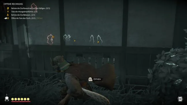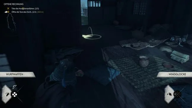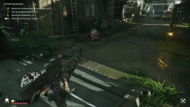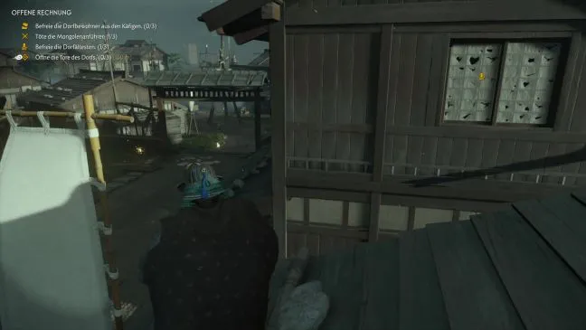Вернитесь на перекресток с флагштоком и направьтесь в противоположную сторону к зданию с большим количеством монголов. Благодаря внимательному прислушиванию вы заметите, что четверо из них находятся на первом этаже, а один, вместе со вторым старейшиной деревни, - на верхнем. Поэтому имеет смысл сначала разобраться с единственным противником и таким образом защитить заложника. Но как добраться туда незаметно для остальных монголов?