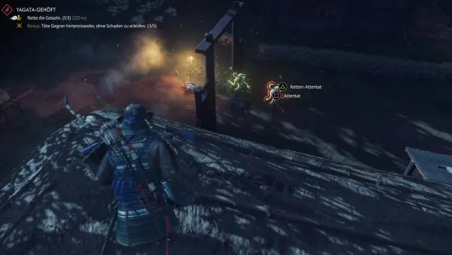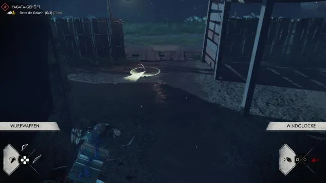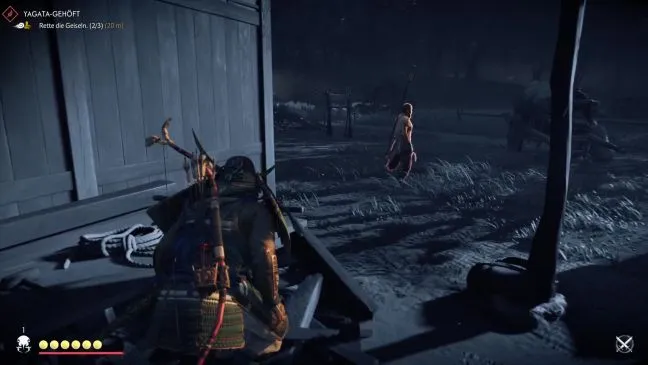 После этого следует разобраться с человеком в крытой зоне, хотя он стоит несколько неуклюже. Точнее, он стоит спиной к углу, поэтому его нельзя ударить сзади. Однако это можно легко изменить, выманив его ветряным колокольчиком.