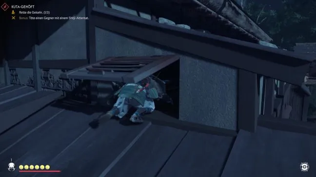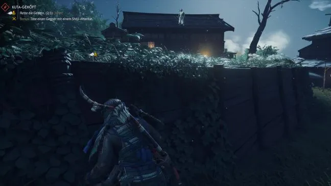 Далее посмотрите вниз и увидите с одной стороны двух врагов, а с другой - заложника, охраняемого двумя собаками. Лучше всего убить животных из лука и подумать, стоит ли таким же образом расправиться с двумя солдатами. Ведь они щедро ходят по местности и большую часть времени находятся далеко друг от друга, поэтому и не замечают так быстро гибель товарища. Если вы хотите быть еще более хитрым, то можете также быстро пробраться в дом через входную дверь с восточной стороны и подождать, пока один из монголов не встанет перед дверью и не станет уязвимым для убийства сёдзи.