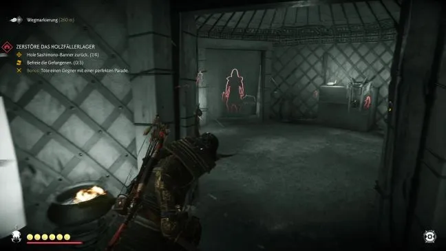 Теперь быстро забегите в небольшую палатку справа и подождите, пока солдат не обнаружит трупы. Убейте его сразу же, пока он не успел поднять тревогу, а затем вернитесь в ту же палатку, из которой вы только что вышли. Она непосредственно связана с двумя другими палатками, которые следует обыскать. В средней из них вы найдете второе знамя Сасимоно, а сверху - спящего солдата, которого вы можете проткнуть мечом в живот.
