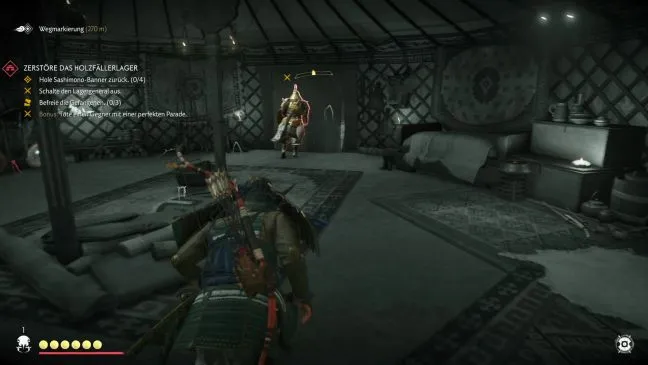 После этого можно рискнуть перенести бой на открытое пространство. Поскольку вы уже уничтожили всех врагов поблизости, никто не придет на помощь генералу. Вы также можете использовать эту возможность, чтобы получить первое знамя Сасимоно, которое также находится в большом шатре.