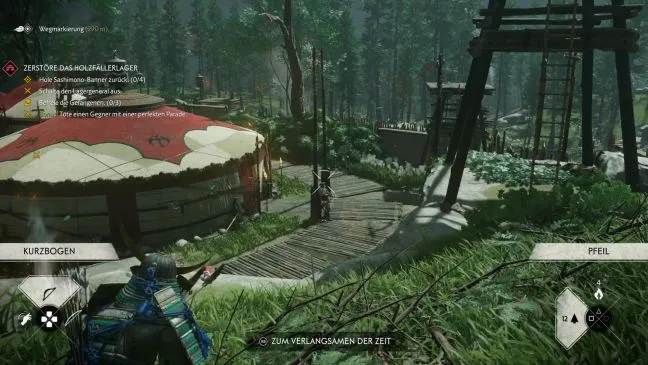 Разрешено: Это последний противник в лагере, поэтому в открытом бою вы бы легко победили. Но если мы собираемся работать идеально, то делайте это правильно! И действительно, после долгих поисков мы нашли путь на платформу, который, тем не менее, несколько необычен. Нужно забраться на открытый шатер возле восточных ворот и оттуда балансировать над балкой ворот. После этого остается только прыгнуть, и стрелок окажется в прошлом.