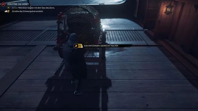 После того как все монголы убиты, все знамена собраны и все соколы освобождены, необходимо выполнить небольшое дополнительное задание: поджечь тайник с черным порохом. Он дьявольски хорошо спрятан, потому что находится в таком месте, где никто в здравом уме не сможет его заподозрить: На корабле! Если быть точным, то это тележка с черным порохом, которую Вы видели в начале миссии и которая стоит на палубе, обращенной к морю.