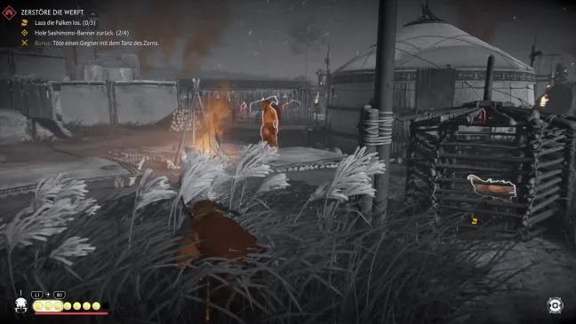Рядом со стрелком находится вторая клетка с ястребом и снова стойка со стрелами. Далее на юге вы встретите еще больше врагов, часть из которых находится у костра, а часть - в палатках. И снова вы можете поиграть с луком в кошки-мышки: Укройтесь за палаткой и убейте случайного монгола выстрелом в голову. Понаблюдайте за его соратниками, когда они всколыхнутся и разбегутся. Продолжайте стрелять из лука, пока никого не останется.