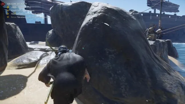 Далее посмотрите направо в сторону моря и обратите внимание на темно-серые камни, лежащие на песке. За ними вы увидите узкий столб с привязанной к нему веревкой, которая, в свою очередь, соединена с кораблем. Осторожно подкрадитесь к этому столбу и разберитесь с двумя рыбаками, сидящими на камне прямо перед ним. Затем заберитесь на канат и быстро перебегите на корабль. Небольшое предупреждение: на короткое время вас могут увидеть со стороны. Однако если вы не остановитесь, то враги быстро потеряют вас из виду.