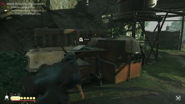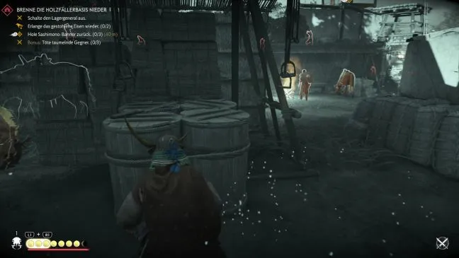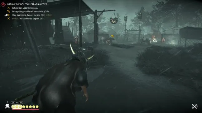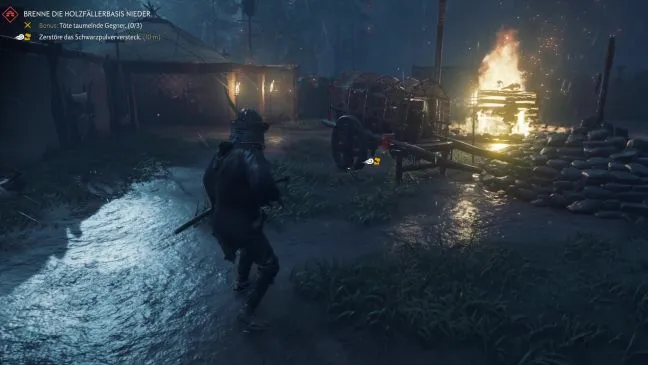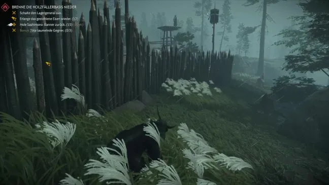 Чтобы не попасть впросак, сначала нужно разобраться с лучником на башне, который не может не использовать свой лук. Однако есть небольшая хитрость, с помощью которой можно незаметно подобраться к нему и сделать лучший выстрел. Для этого подойдите к пучкам соломы, сложенным с правой стороны, и перейдите на пампасную траву рядом с ними. Там вы должны найти щель в заборе, через которую можно покинуть лагерь. Если затем повернуть налево, то стрелок снова окажется в поле зрения и сможет приблизиться на несколько метров, прежде чем пустить стрелу ему в голову.