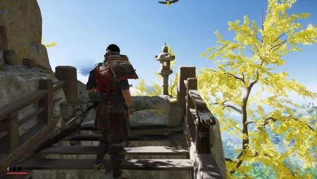 На самом верху, балансируя над последней деревянной балкой, перепрыгните на платформу с цветами и поднимайтесь по скале вправо, пока снова не доберетесь до безопасных ступеней. Они приведут вас прямо к Талисману Аматерасу.