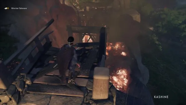Первые участки моста еще можно легко преодолеть, балансируя на торчащих узких балках. Вы дойдете до горящего каменного фонаря, где мост слева от Вас продолжается вверх. Однако Вы не сможете легко преодолеть следующий промежуток, так как он слишком широк.