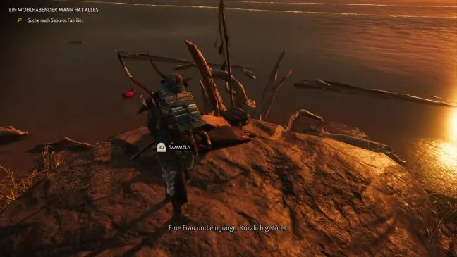 К сожалению, после вашей победы не осталось никаких следов семьи Сабуро. Поэтому Вам следует внимательнее присмотреться к мертвым деревьям и севшим на мель лодкам в направлении северо-запада. На крайнем северо-западе новой целевой зоны вы наткнетесь на камень чуть большего размера, на краю которого лежат трупы женщины и мальчика. С этой печальной уверенностью вы возвращаетесь в лагерь выживших и сообщаете Сабуро новость о гибели его семьи. В конце вы получите Талисман счастливого возвращения.