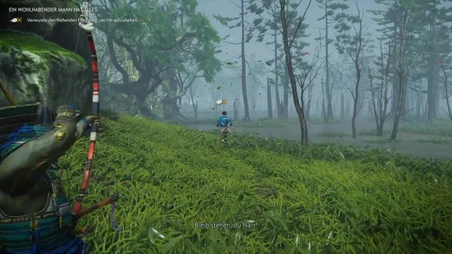 Поэтому вы опрашиваете оставшихся в живых, сразу же замечая мужчину, стоящего сзади слева, и его нервную дрожь. Как только вы поговорили более чем с тремя людьми, он убегает. Вы тут же достаете лук и стреляете ему в ногу. В конце концов, стрелять в голову - не самая лучшая идея, если вы хотите получить от него хоть какую-то информацию.