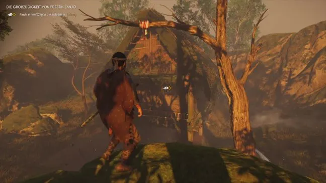 На первый взгляд, нигде не видно входа, через который можно было бы попасть в здание. Однако если вы заберетесь на скалу к западу, то должны обратить внимание на дерево с качающимся крюком. С его помощью можно перепрыгнуть на крышу переднего этажа и пролезть через небольшую решетку.
