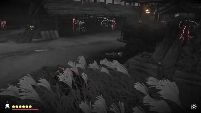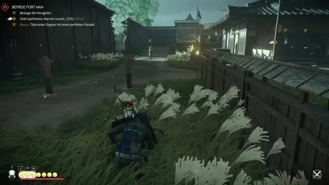 Поэтому подождите, пока ситуация не разрядится. Затем войдите в южную зону и быстро пробегите влево за площадь с мишенями. Там же можно спрятаться в траве и наблюдать за двумя солдатами, которые находятся на юго-западной стороне или возле большого отверстия в стене. Один из них сидит и возится с кучей белых тряпок, а другой марширует взад-вперед. Как только оба повернутся к вам спиной, вы можете ударить их сзади одного за другим. Наконец, на пути должен появиться желтый стрелок, вооруженный огненными стрелами. Убив его, возьмите четвертое знамя сасимоно в здании.